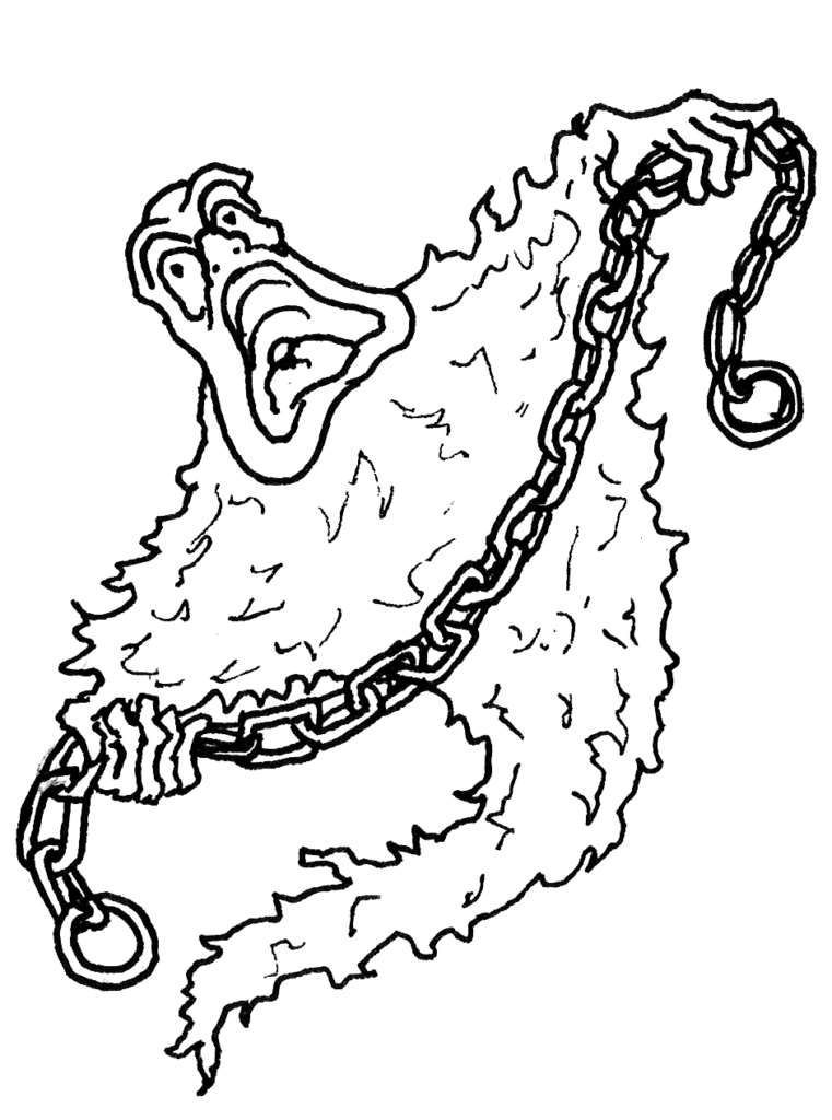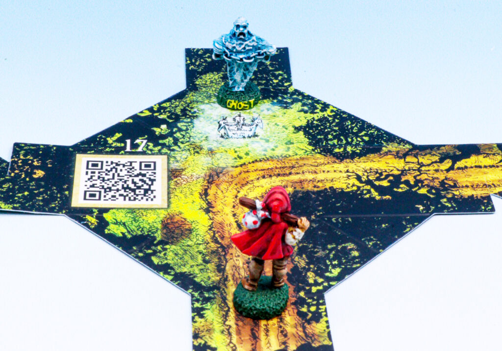 In a small clearing by a turn in the path stands a crumbling gravestone. A pale mist swirls about it. As you approach it rises and twists into the looming shape of a figure. Test Courage. If successful you may remain on the tile. If not lose 1 Endurance and flee back to the tile from which you have come.