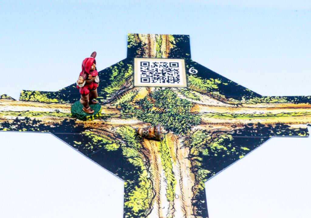 From a gnarled oak tree in the centre of the crossroads hangs a large horn bound in silver. Next to it a wooden board reads: