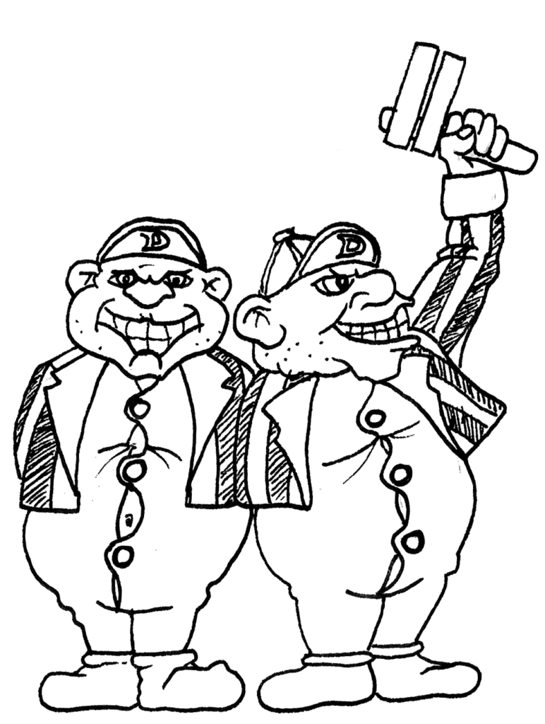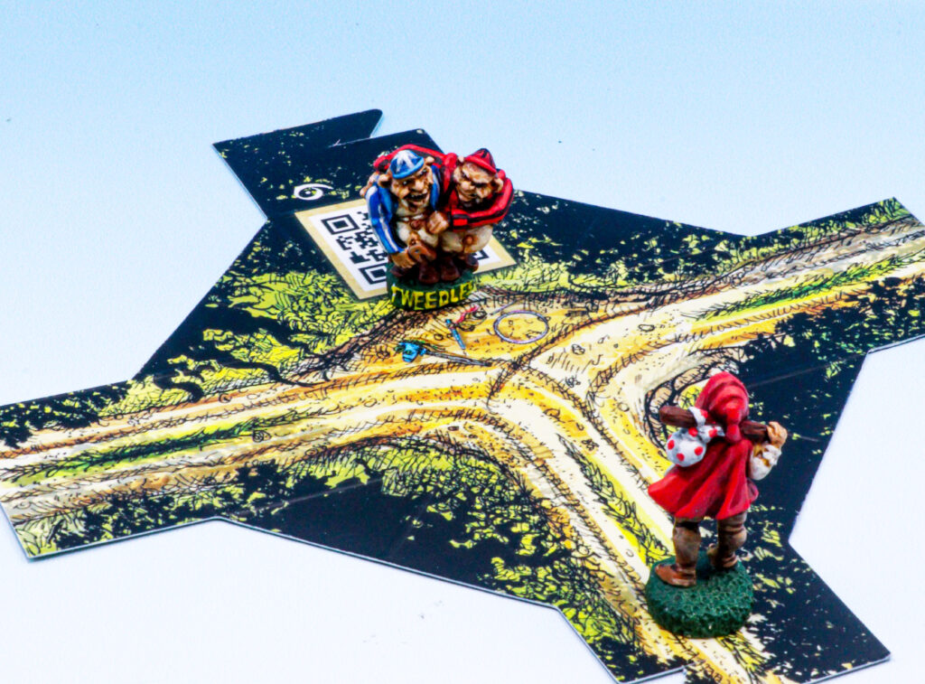 You may leave this tile by the path you came in on, but if you wish to leave via one of the others you must outwit the pair. Test Wisdom to gain access to one of the paths. If you are successful you may leave the tile via that exit, but leave the Tweedles’ miniature on the tile, you’ll need to face them again if you pass this way.