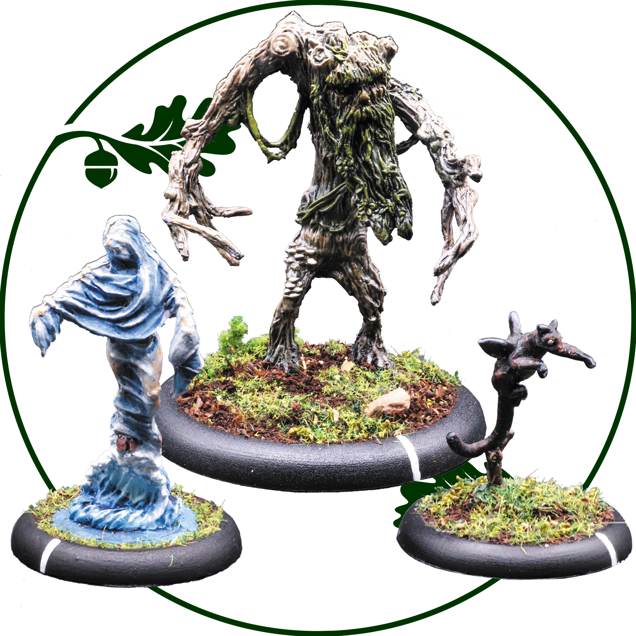 Makar sing their odes to the land, summoning elemental beings of great strength. Spirits of water, wood and air rise forth to defend their habitats. Three pewter miniatures supplied with round, lipped bases.