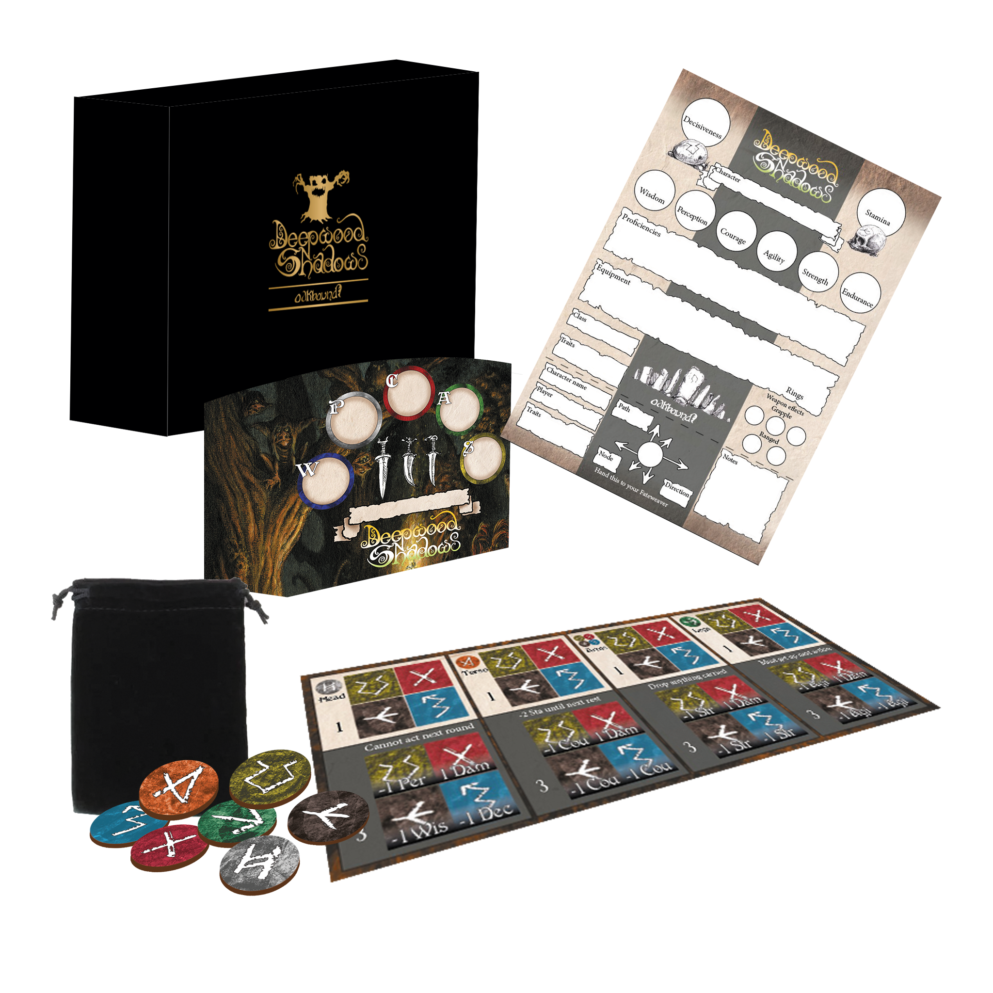 All the items a player needs for games of Deepwood Shadows, The Woods RPG.