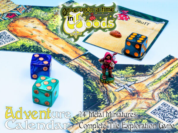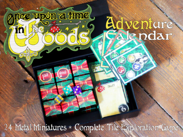 Each day of advent there’s a parcel to open which will contain a metal figurine, a board tile for building up a map of the forest and rules for whatever encounter is lying in wait. Using a simple dice-rolling mechanic you’ll face nasties, pick up items and discover allies to help you along your way. Boxes are opened at random, so everyone playing will have a slightly different adventure.
