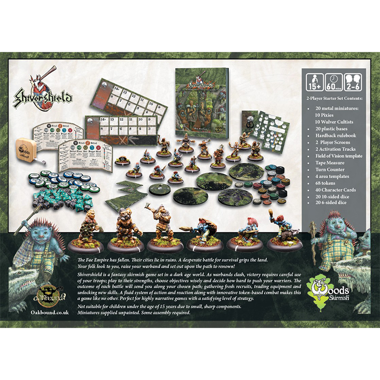 20 metal miniatures, hardback rulebook, 2 player screens, 2 activation slates, tape measure, field of vision template, turn counter, 4 terrain templates, 40 dice and a host of tokens and cards… PLUS! For pre-order sets only, a FREE limited edition miniature to boost the Wildfolk force included in the set.